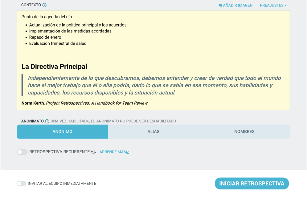 Esta es sólo una de las razones por las que lo tenemos como texto por defecto en el Contexto y el Orden del día de tus reuniones retrospectivas. Como nuevo equipo, es importante repasar esto como punto de partida, o adaptarlo en función de la dinámica de su equipo.
